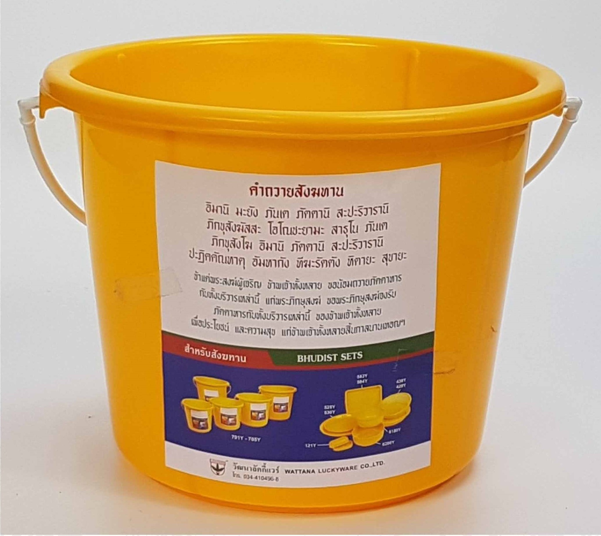 ถังน้ำพลาสติก 4.5 แกลลอน ขนาดกว้าง 32 ซม. สูง 32 ซม. ใช้บรรจุน้ำ เป็นถังสังฆทาน